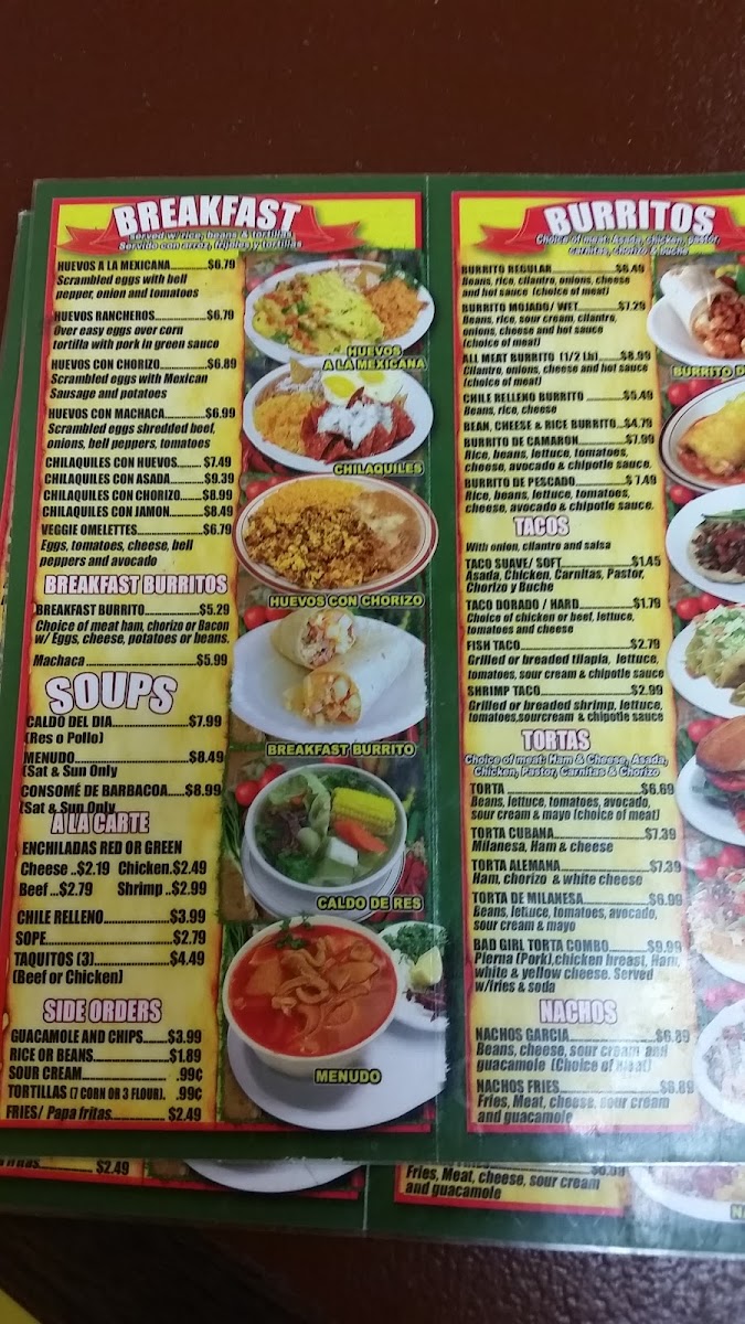 Side dishes such as Beans, Rice, French Fries, Guacamole, and Sour Cream make great additions, while the Nachos Garcia and Nachos Fries stand out as loaded, savory treats. À la carte items like Chile Relleno, Sope, Enchiladas, and Taquitos provide flexibility for customizing your meal.